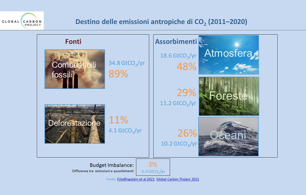 Le foreste sono responsabili, insieme agli oceani, dell’assorbimento di più della metà delle emissioni di origine antropica in atmosfera, che nel 2021 ammontavano a 39,7 GtCO2